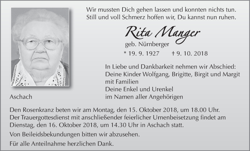 Hier finden Sie alle Traueranzeigen aus der Zeitung, die bisher für Rita Manger erschienen sind. Weitere Traueranzeigen, die in der Zeitung erscheinen, werden hier ebenfalls aufgelistet