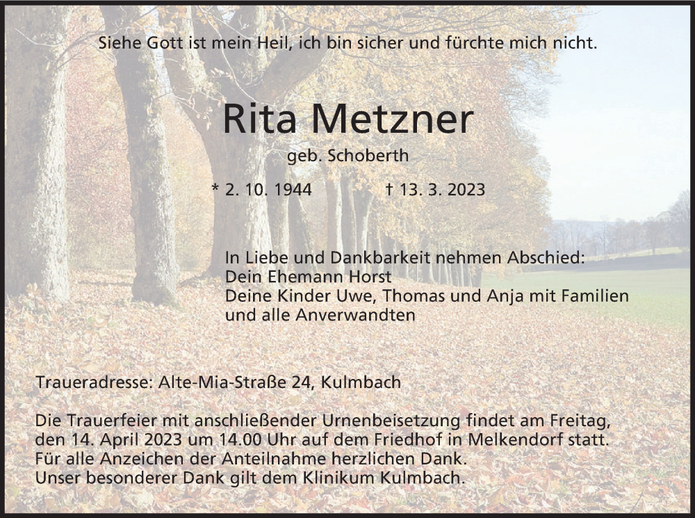 Hier finden Sie alle Traueranzeigen aus der Zeitung, die bisher für Rita Metzner erschienen sind. Weitere Traueranzeigen, die in der Zeitung erscheinen, werden hier ebenfalls aufgelistet