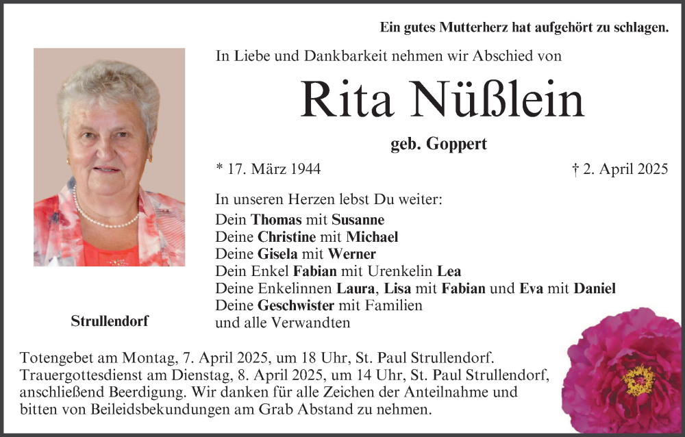 Hier finden Sie alle Traueranzeigen aus der Zeitung, die bisher für Rita Nüßlein erschienen sind. Weitere Traueranzeigen, die in der Zeitung erscheinen, werden hier ebenfalls aufgelistet