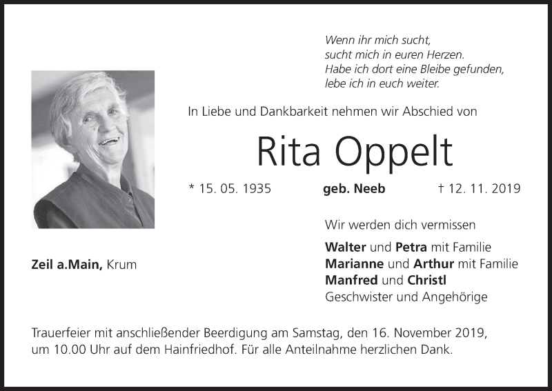 Hier finden Sie alle Traueranzeigen aus der Zeitung, die bisher für Rita Oppelt erschienen sind. Weitere Traueranzeigen, die in der Zeitung erscheinen, werden hier ebenfalls aufgelistet
