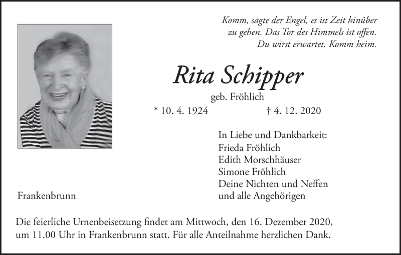 Hier finden Sie alle Traueranzeigen aus der Zeitung, die bisher für Rita Schipper erschienen sind. Weitere Traueranzeigen, die in der Zeitung erscheinen, werden hier ebenfalls aufgelistet