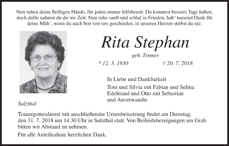 Hier finden Sie alle Traueranzeigen aus der Zeitung, die bisher für Rita Stephan erschienen sind. Weitere Traueranzeigen, die in der Zeitung erscheinen, werden hier ebenfalls aufgelistet