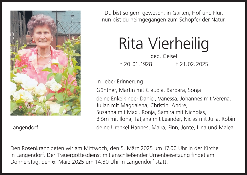 Hier finden Sie alle Traueranzeigen aus der Zeitung, die bisher für Rita Vierheilig erschienen sind. Weitere Traueranzeigen, die in der Zeitung erscheinen, werden hier ebenfalls aufgelistet
