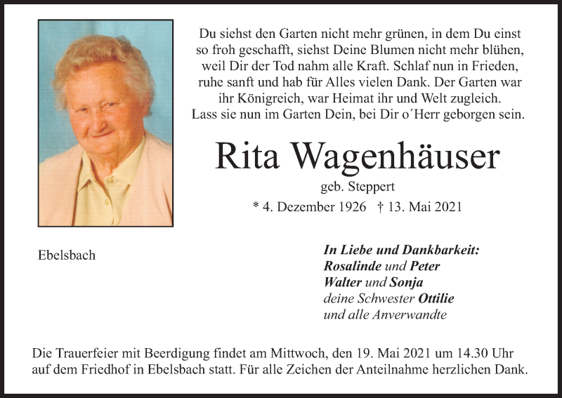 Hier finden Sie alle Traueranzeigen aus der Zeitung, die bisher für Rita Wagenhäuser erschienen sind. Weitere Traueranzeigen, die in der Zeitung erscheinen, werden hier ebenfalls aufgelistet