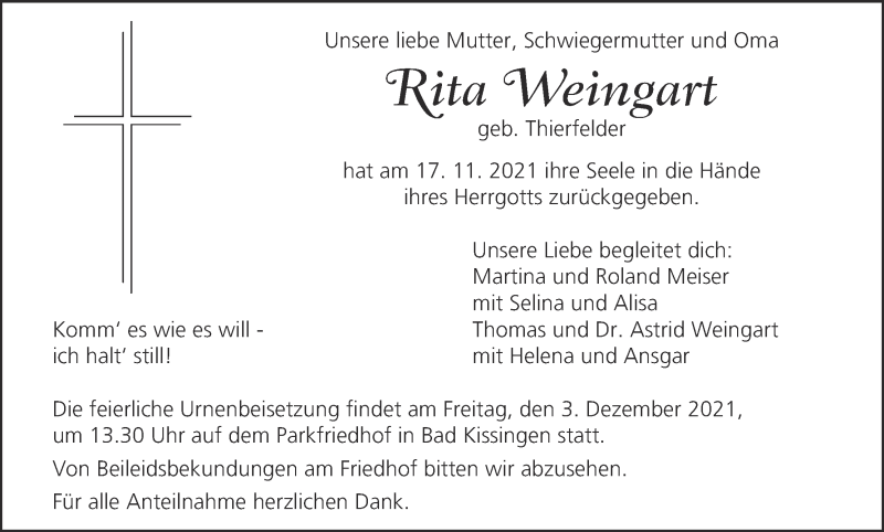 Hier finden Sie alle Traueranzeigen aus der Zeitung, die bisher für Rita Weingart erschienen sind. Weitere Traueranzeigen, die in der Zeitung erscheinen, werden hier ebenfalls aufgelistet