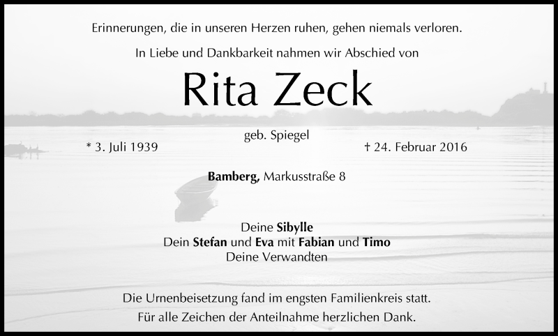 Hier finden Sie alle Traueranzeigen aus der Zeitung, die bisher für Rita Zeck erschienen sind. Weitere Traueranzeigen, die in der Zeitung erscheinen, werden hier ebenfalls aufgelistet