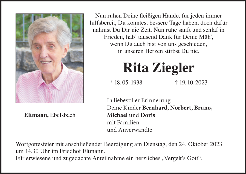 Hier finden Sie alle Traueranzeigen aus der Zeitung, die bisher für Rita Ziegler erschienen sind. Weitere Traueranzeigen, die in der Zeitung erscheinen, werden hier ebenfalls aufgelistet