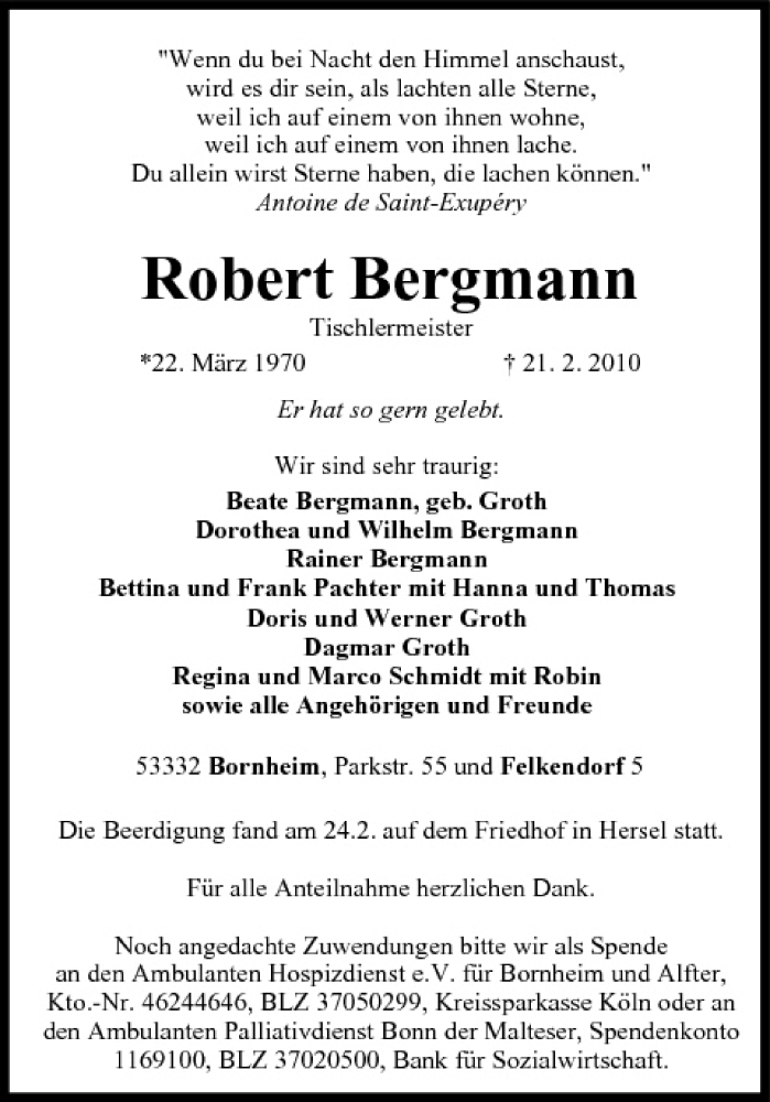 Hier finden Sie alle Traueranzeigen aus der Zeitung, die bisher für Robert Bergmann erschienen sind. Weitere Traueranzeigen, die in der Zeitung erscheinen, werden hier ebenfalls aufgelistet