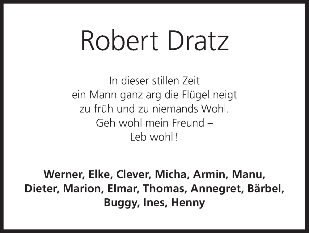 Hier finden Sie alle Traueranzeigen aus der Zeitung, die bisher für Robert Dratz erschienen sind. Weitere Traueranzeigen, die in der Zeitung erscheinen, werden hier ebenfalls aufgelistet