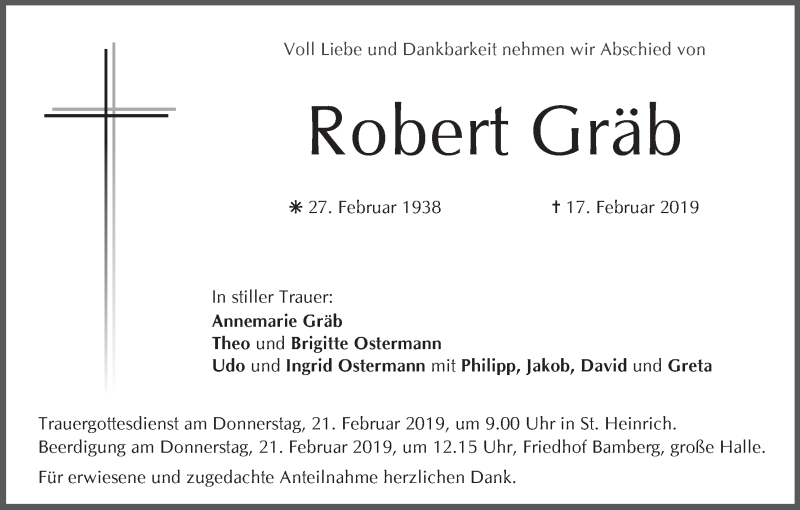 Hier finden Sie alle Traueranzeigen aus der Zeitung, die bisher für Robert Gräb erschienen sind. Weitere Traueranzeigen, die in der Zeitung erscheinen, werden hier ebenfalls aufgelistet