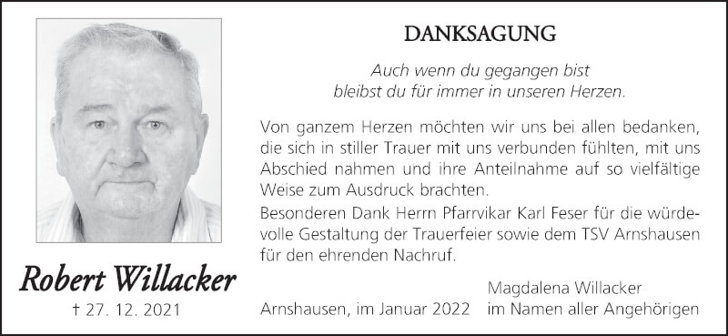 Hier finden Sie alle Traueranzeigen aus der Zeitung, die bisher für Robert Willacker erschienen sind. Weitere Traueranzeigen, die in der Zeitung erscheinen, werden hier ebenfalls aufgelistet