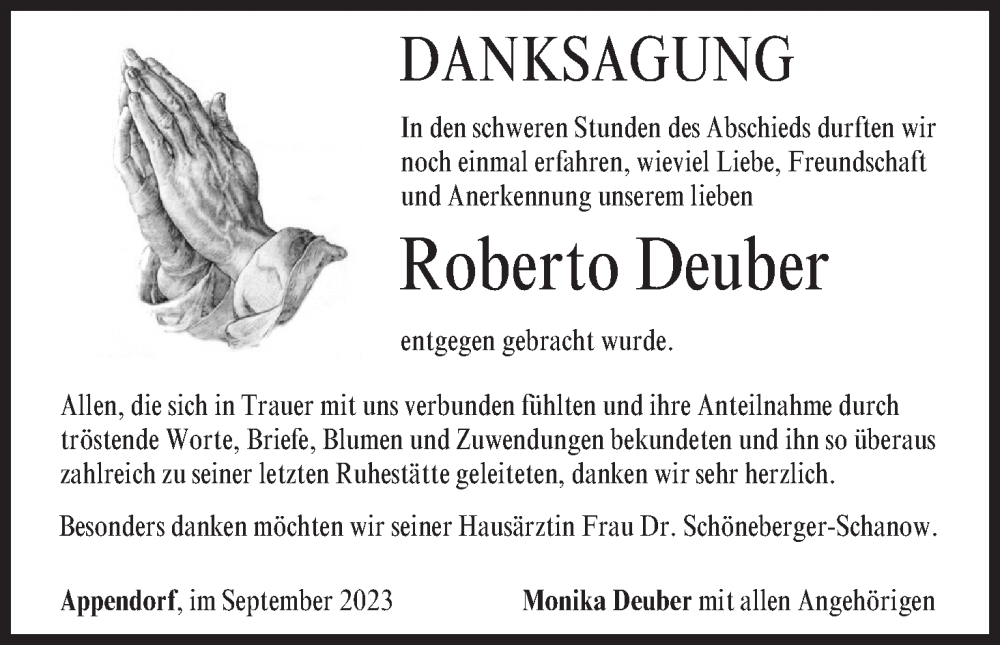 Hier finden Sie alle Traueranzeigen aus der Zeitung, die bisher für Roberto Deuber erschienen sind. Weitere Traueranzeigen, die in der Zeitung erscheinen, werden hier ebenfalls aufgelistet