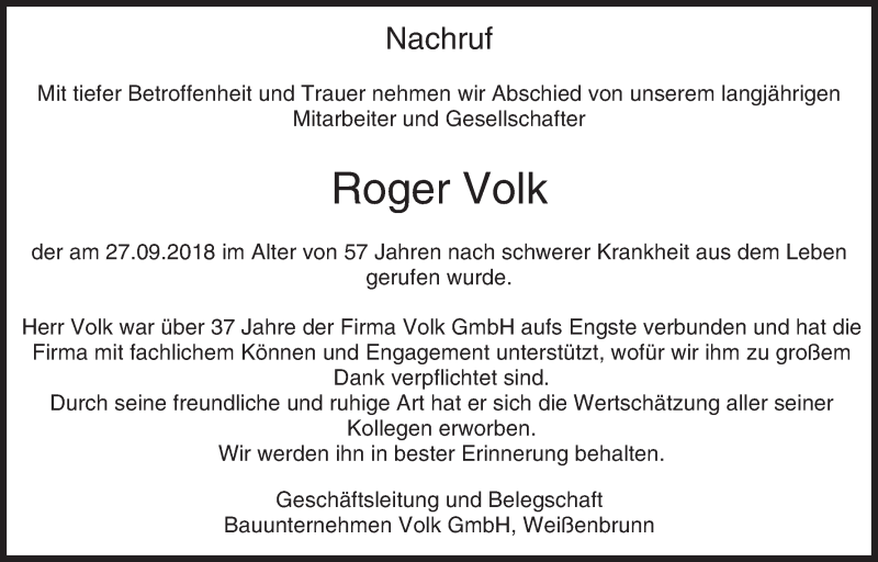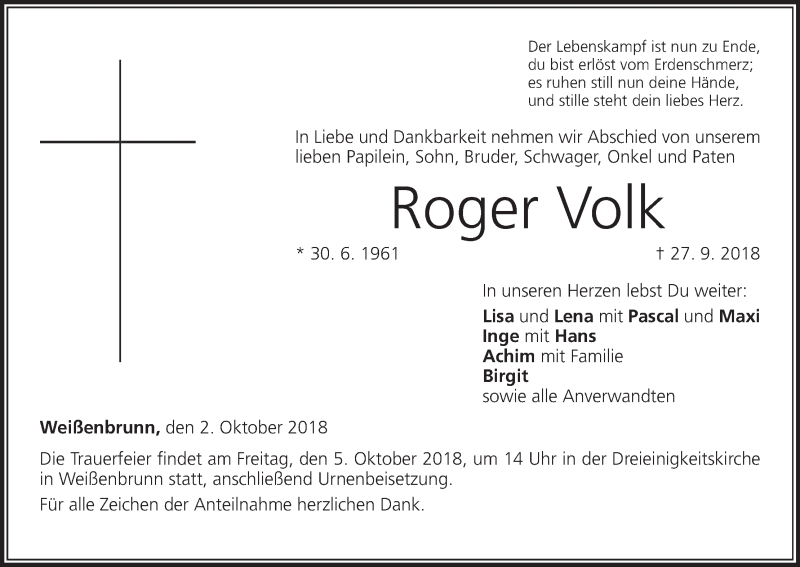 Hier finden Sie alle Traueranzeigen aus der Zeitung, die bisher für Roger Volk erschienen sind. Weitere Traueranzeigen, die in der Zeitung erscheinen, werden hier ebenfalls aufgelistet
