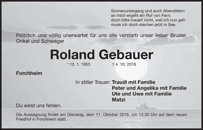 Hier finden Sie alle Traueranzeigen aus der Zeitung, die bisher für Roland Gebauer erschienen sind. Weitere Traueranzeigen, die in der Zeitung erscheinen, werden hier ebenfalls aufgelistet