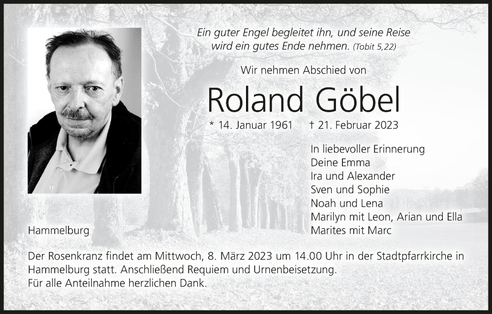 Hier finden Sie alle Traueranzeigen aus der Zeitung, die bisher für Roland Göbel erschienen sind. Weitere Traueranzeigen, die in der Zeitung erscheinen, werden hier ebenfalls aufgelistet