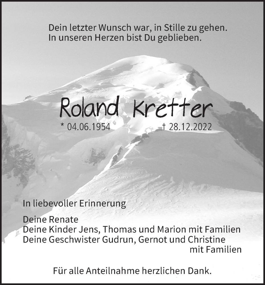 Hier finden Sie alle Traueranzeigen aus der Zeitung, die bisher für Roland Kretter erschienen sind. Weitere Traueranzeigen, die in der Zeitung erscheinen, werden hier ebenfalls aufgelistet