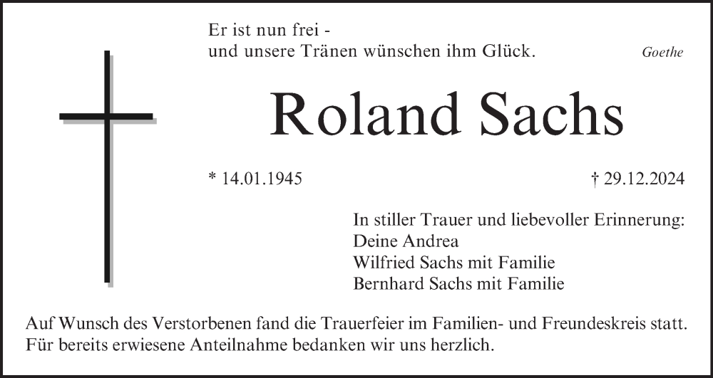 Hier finden Sie alle Traueranzeigen aus der Zeitung, die bisher für Roland Sachs erschienen sind. Weitere Traueranzeigen, die in der Zeitung erscheinen, werden hier ebenfalls aufgelistet