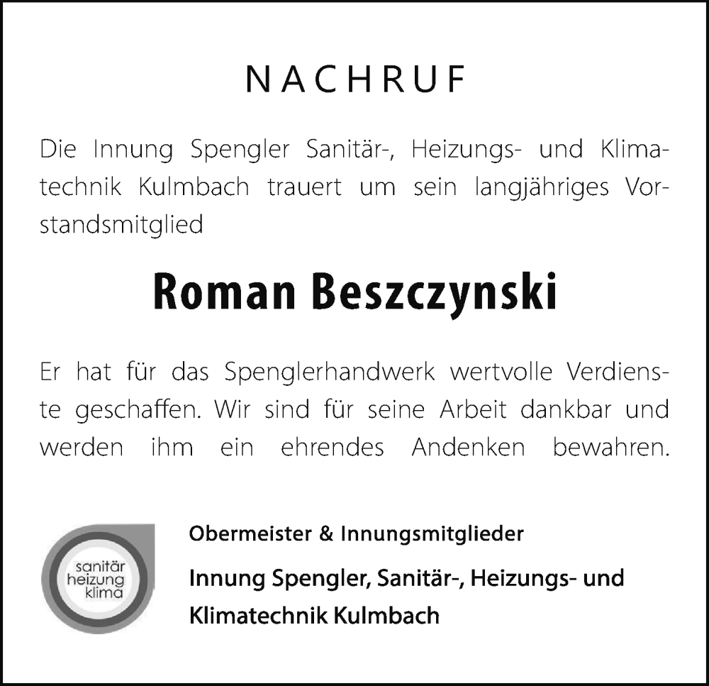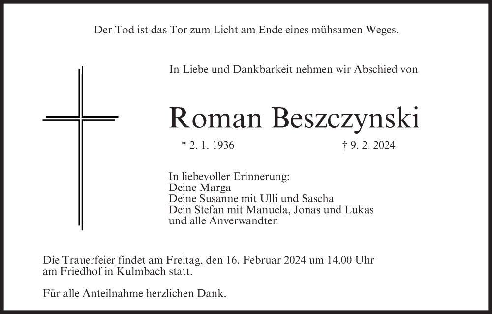Hier finden Sie alle Traueranzeigen aus der Zeitung, die bisher für Roman Beszczynski erschienen sind. Weitere Traueranzeigen, die in der Zeitung erscheinen, werden hier ebenfalls aufgelistet