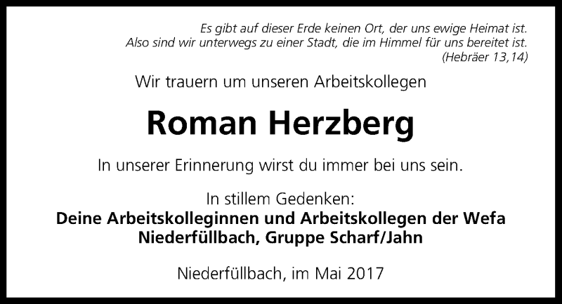 Hier finden Sie alle Traueranzeigen aus der Zeitung, die bisher für Roman Herzberg erschienen sind. Weitere Traueranzeigen, die in der Zeitung erscheinen, werden hier ebenfalls aufgelistet