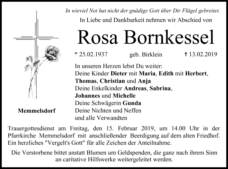 Hier finden Sie alle Traueranzeigen aus der Zeitung, die bisher für Rosa Bornkessel erschienen sind. Weitere Traueranzeigen, die in der Zeitung erscheinen, werden hier ebenfalls aufgelistet