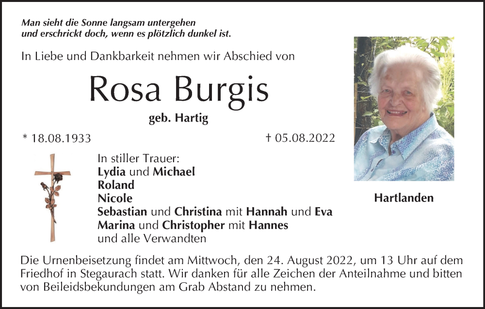 Hier finden Sie alle Traueranzeigen aus der Zeitung, die bisher für Rosa Burgis erschienen sind. Weitere Traueranzeigen, die in der Zeitung erscheinen, werden hier ebenfalls aufgelistet