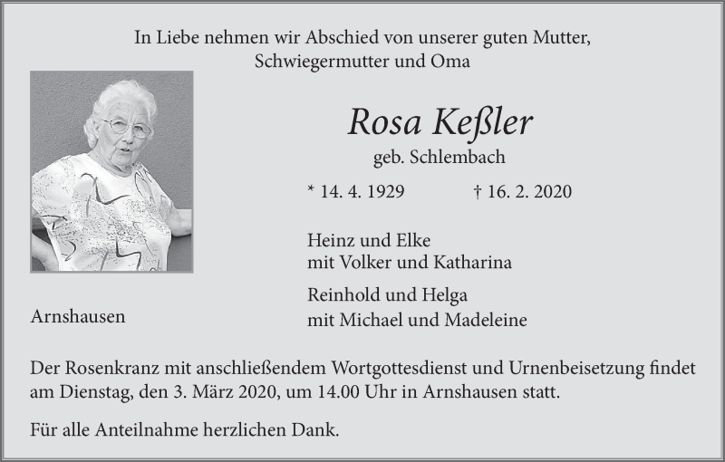Hier finden Sie alle Traueranzeigen aus der Zeitung, die bisher für Rosa Keßler erschienen sind. Weitere Traueranzeigen, die in der Zeitung erscheinen, werden hier ebenfalls aufgelistet