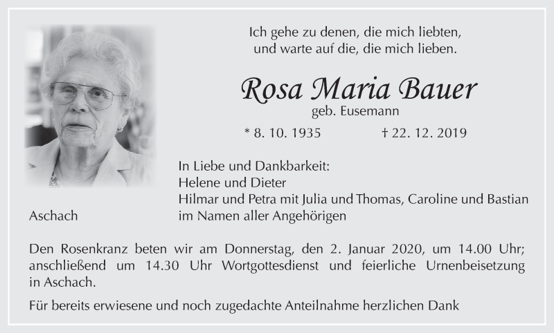 Hier finden Sie alle Traueranzeigen aus der Zeitung, die bisher für Rosa Maria Bauer erschienen sind. Weitere Traueranzeigen, die in der Zeitung erscheinen, werden hier ebenfalls aufgelistet