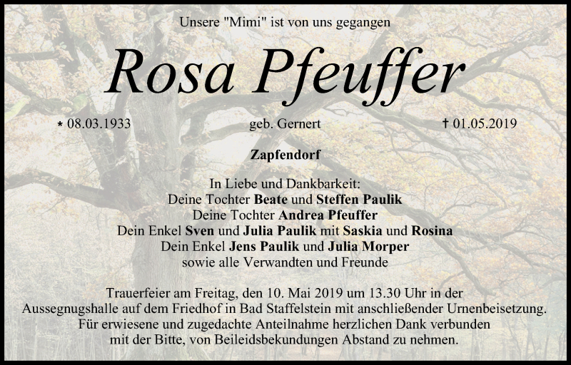 Hier finden Sie alle Traueranzeigen aus der Zeitung, die bisher für Rosa Pfeuffer erschienen sind. Weitere Traueranzeigen, die in der Zeitung erscheinen, werden hier ebenfalls aufgelistet