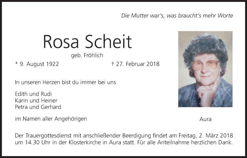 Hier finden Sie alle Traueranzeigen aus der Zeitung, die bisher für Rosa Scheit erschienen sind. Weitere Traueranzeigen, die in der Zeitung erscheinen, werden hier ebenfalls aufgelistet