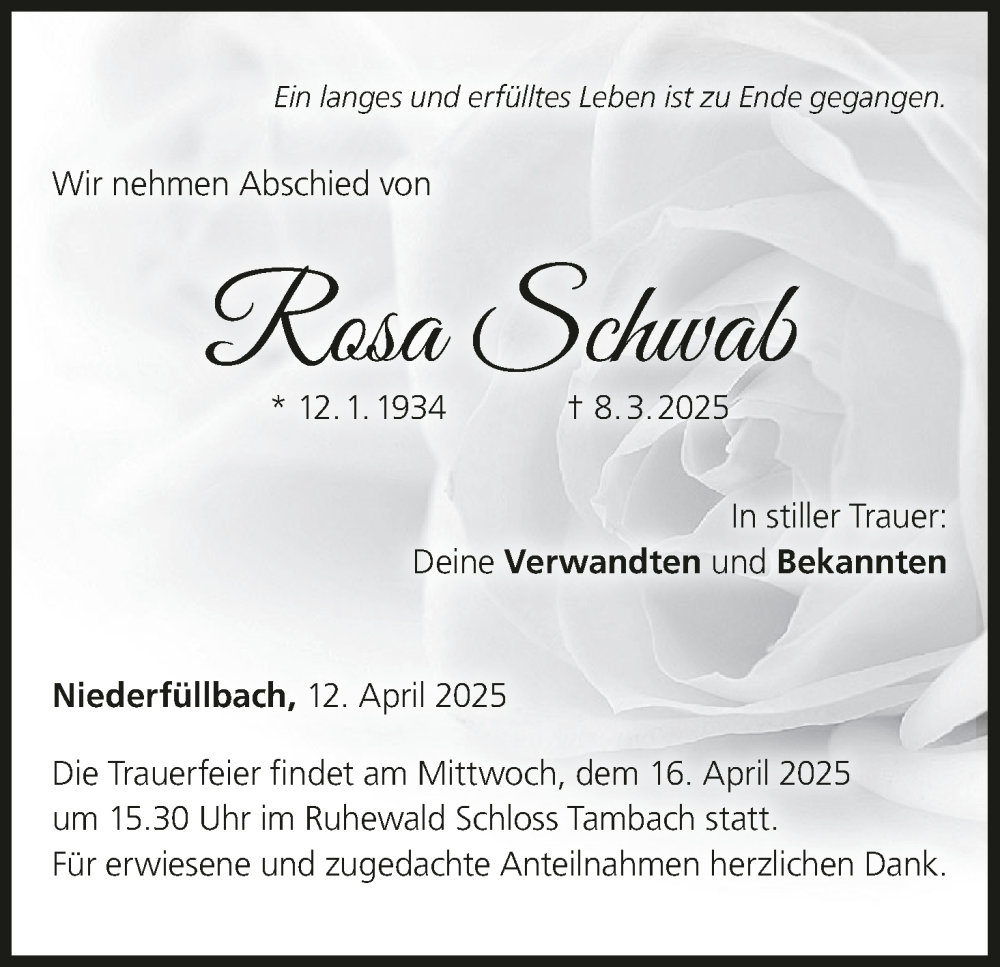 Hier finden Sie alle Traueranzeigen aus der Zeitung, die bisher für Rosa Schwab erschienen sind. Weitere Traueranzeigen, die in der Zeitung erscheinen, werden hier ebenfalls aufgelistet