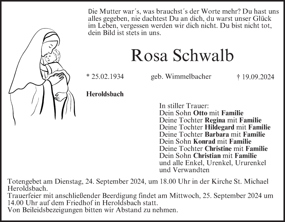 Hier finden Sie alle Traueranzeigen aus der Zeitung, die bisher für Rosa Schwalb erschienen sind. Weitere Traueranzeigen, die in der Zeitung erscheinen, werden hier ebenfalls aufgelistet
