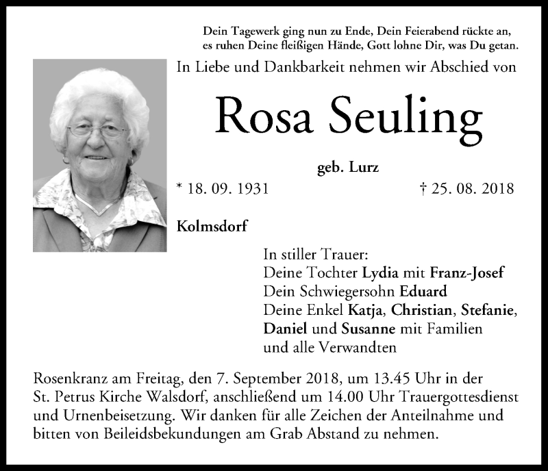 Hier finden Sie alle Traueranzeigen aus der Zeitung, die bisher für Rosa Seuling erschienen sind. Weitere Traueranzeigen, die in der Zeitung erscheinen, werden hier ebenfalls aufgelistet