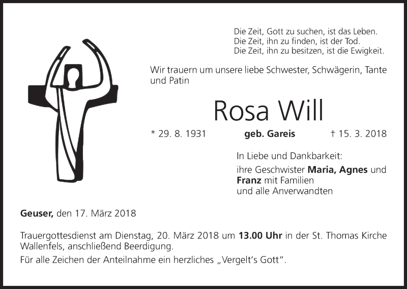 Hier finden Sie alle Traueranzeigen aus der Zeitung, die bisher für Rosa Will erschienen sind. Weitere Traueranzeigen, die in der Zeitung erscheinen, werden hier ebenfalls aufgelistet