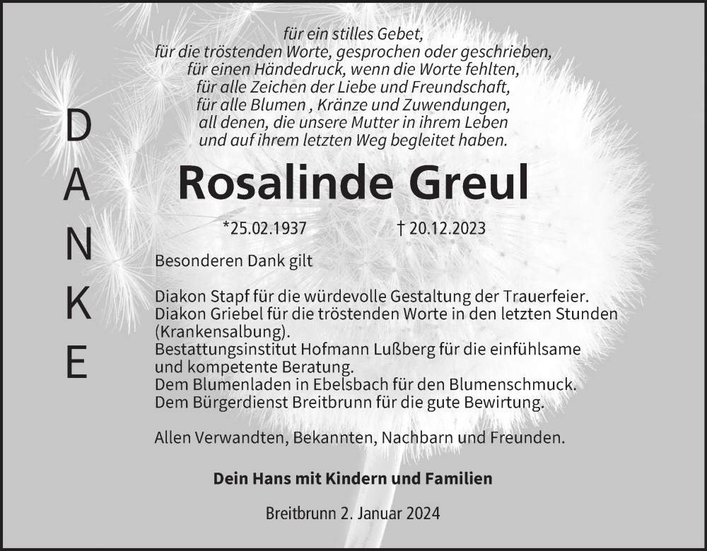 Hier finden Sie alle Traueranzeigen aus der Zeitung, die bisher für Rosalinde Greul erschienen sind. Weitere Traueranzeigen, die in der Zeitung erscheinen, werden hier ebenfalls aufgelistet