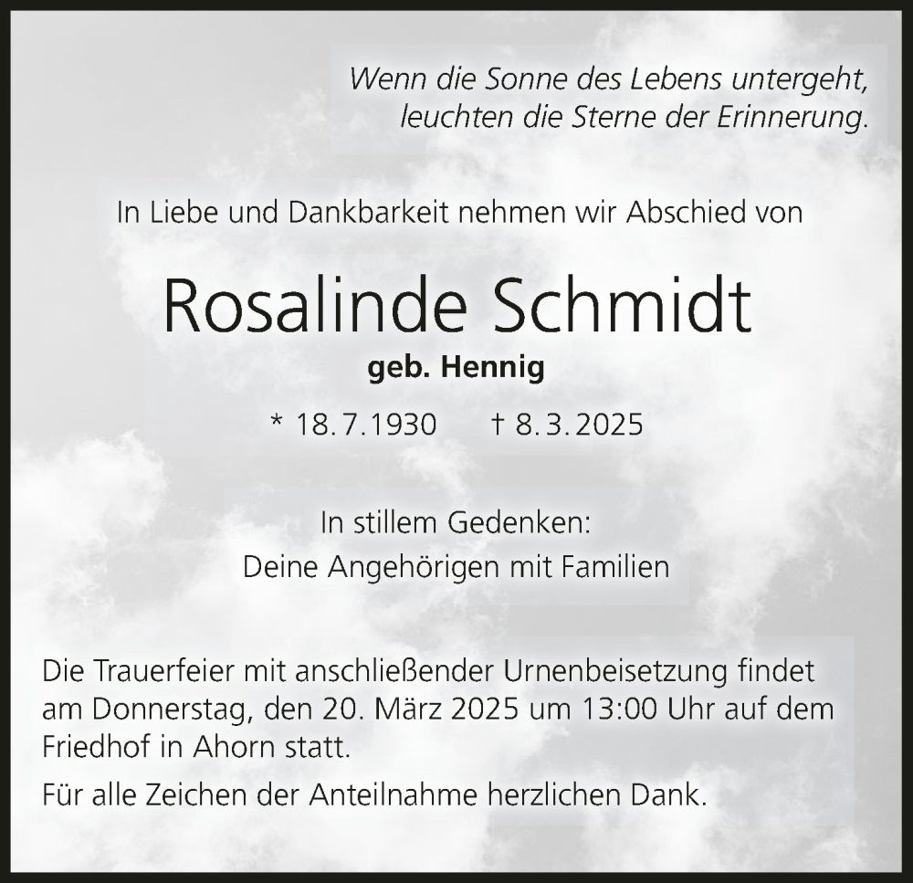 Hier finden Sie alle Traueranzeigen aus der Zeitung, die bisher für Rosalinde Schmidt erschienen sind. Weitere Traueranzeigen, die in der Zeitung erscheinen, werden hier ebenfalls aufgelistet