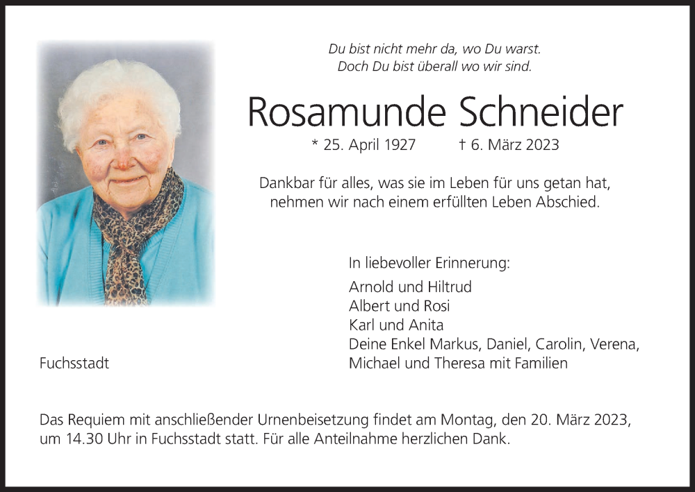 Hier finden Sie alle Traueranzeigen aus der Zeitung, die bisher für Rosamunde Schneider erschienen sind. Weitere Traueranzeigen, die in der Zeitung erscheinen, werden hier ebenfalls aufgelistet