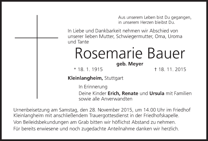 Hier finden Sie alle Traueranzeigen aus der Zeitung, die bisher für Rosemarie Bauer erschienen sind. Weitere Traueranzeigen, die in der Zeitung erscheinen, werden hier ebenfalls aufgelistet