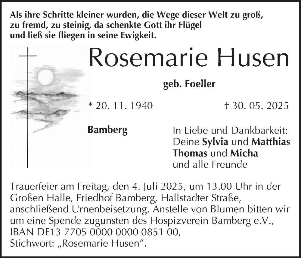 Hier finden Sie alle Traueranzeigen aus der Zeitung, die bisher für Rosemarie Husen erschienen sind. Weitere Traueranzeigen, die in der Zeitung erscheinen, werden hier ebenfalls aufgelistet