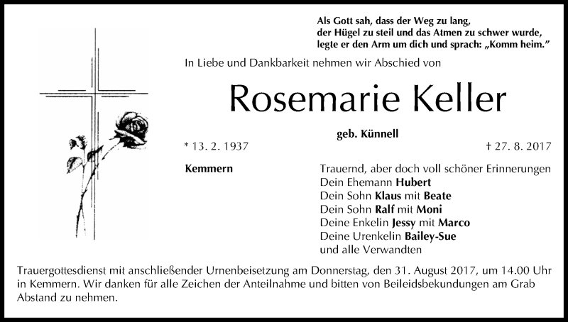 Hier finden Sie alle Traueranzeigen aus der Zeitung, die bisher für Rosemarie Keller erschienen sind. Weitere Traueranzeigen, die in der Zeitung erscheinen, werden hier ebenfalls aufgelistet