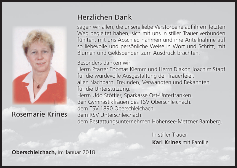 Hier finden Sie alle Traueranzeigen aus der Zeitung, die bisher für Rosemarie Krines erschienen sind. Weitere Traueranzeigen, die in der Zeitung erscheinen, werden hier ebenfalls aufgelistet