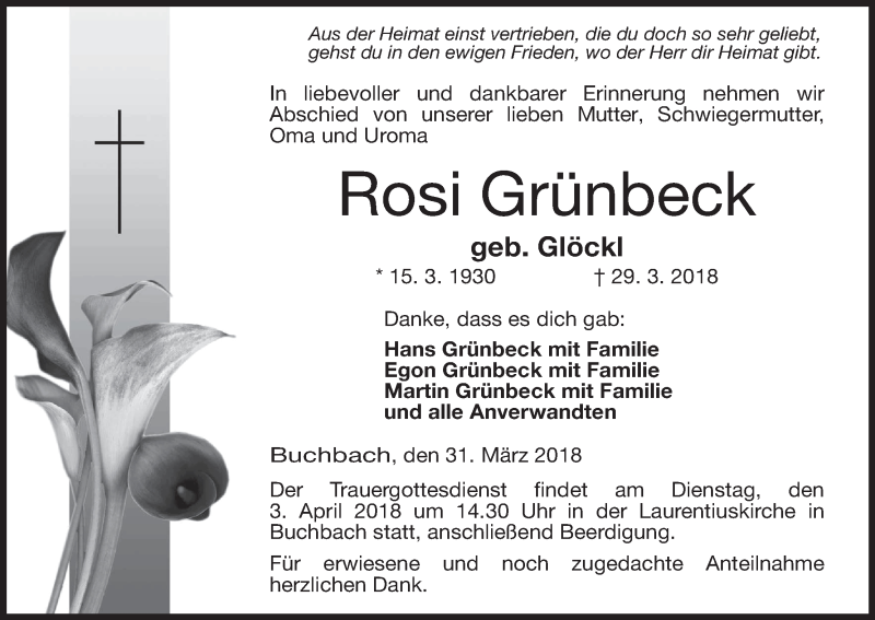 Hier finden Sie alle Traueranzeigen aus der Zeitung, die bisher für Rosi Grünbeck erschienen sind. Weitere Traueranzeigen, die in der Zeitung erscheinen, werden hier ebenfalls aufgelistet