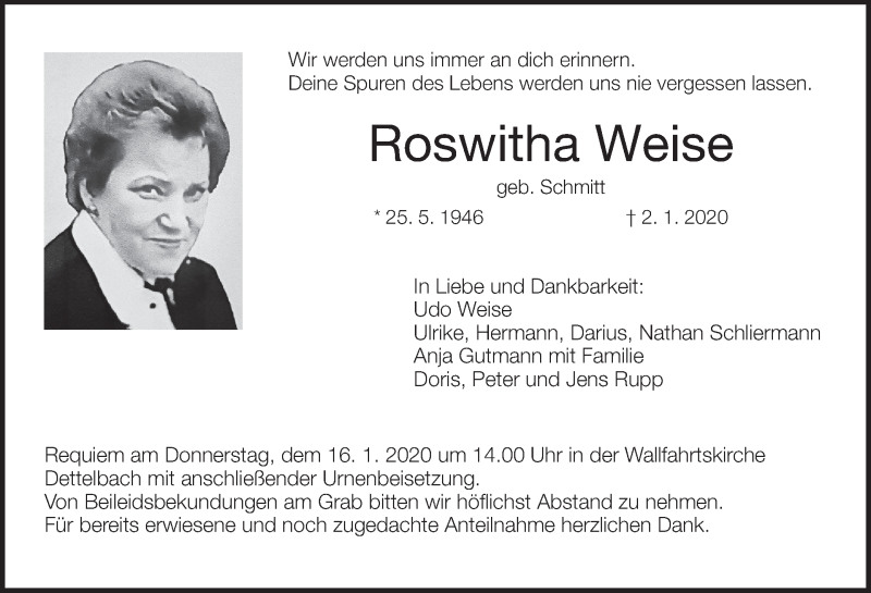 Hier finden Sie alle Traueranzeigen aus der Zeitung, die bisher für Roswitha Weise erschienen sind. Weitere Traueranzeigen, die in der Zeitung erscheinen, werden hier ebenfalls aufgelistet