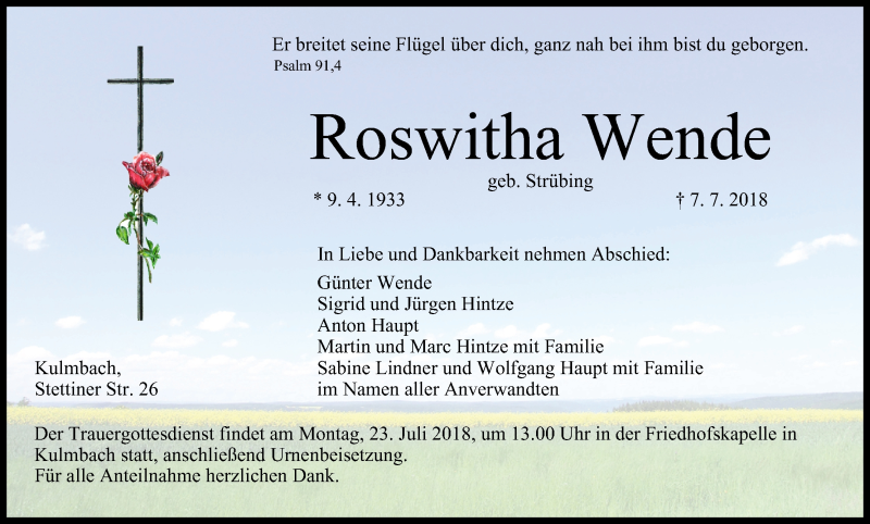 Hier finden Sie alle Traueranzeigen aus der Zeitung, die bisher für Roswitha Wende erschienen sind. Weitere Traueranzeigen, die in der Zeitung erscheinen, werden hier ebenfalls aufgelistet