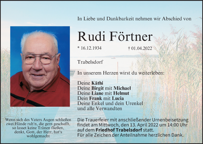 Hier finden Sie alle Traueranzeigen aus der Zeitung, die bisher für Rudi Förtner erschienen sind. Weitere Traueranzeigen, die in der Zeitung erscheinen, werden hier ebenfalls aufgelistet