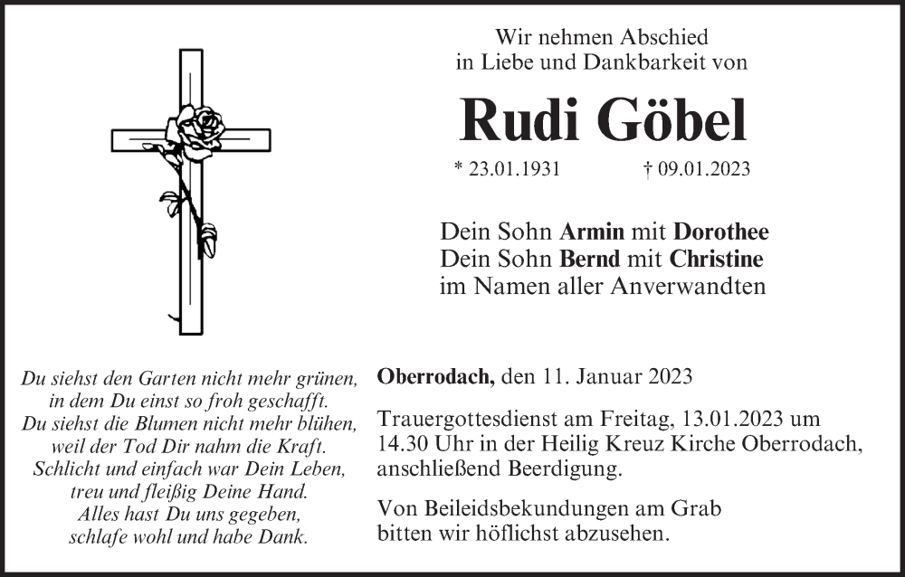 Hier finden Sie alle Traueranzeigen aus der Zeitung, die bisher für Rudi Göbel erschienen sind. Weitere Traueranzeigen, die in der Zeitung erscheinen, werden hier ebenfalls aufgelistet