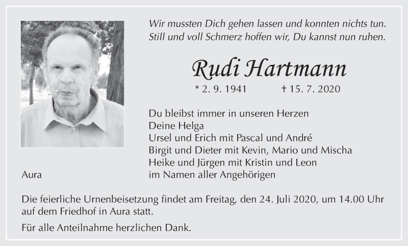 Hier finden Sie alle Traueranzeigen aus der Zeitung, die bisher für Rudi Hartmann erschienen sind. Weitere Traueranzeigen, die in der Zeitung erscheinen, werden hier ebenfalls aufgelistet
