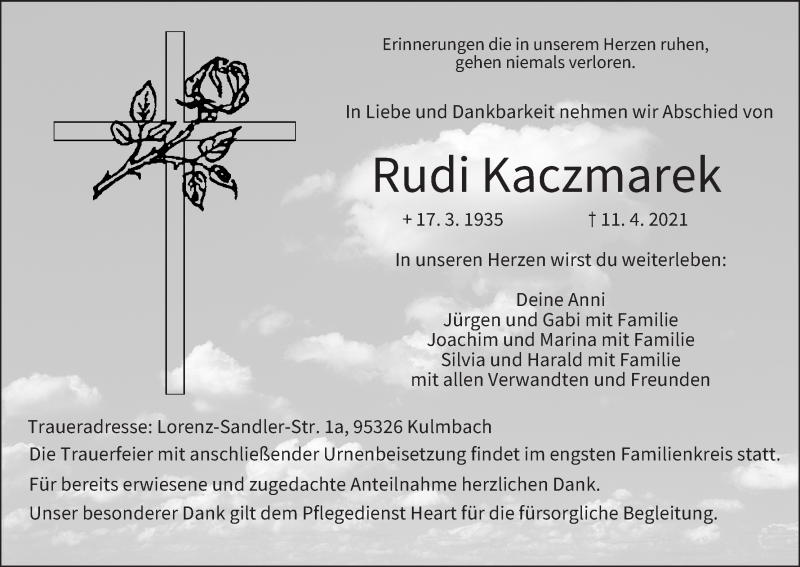 Hier finden Sie alle Traueranzeigen aus der Zeitung, die bisher für Rudi Kaczmarek erschienen sind. Weitere Traueranzeigen, die in der Zeitung erscheinen, werden hier ebenfalls aufgelistet