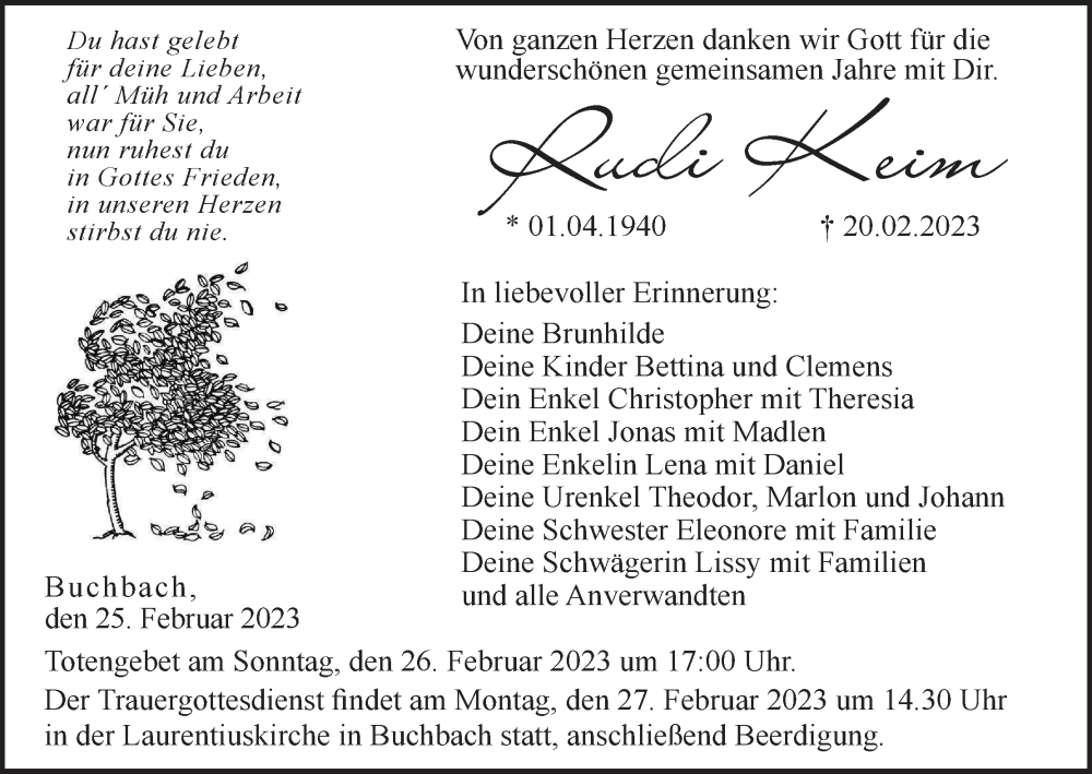 Hier finden Sie alle Traueranzeigen aus der Zeitung, die bisher für Rudi Keim erschienen sind. Weitere Traueranzeigen, die in der Zeitung erscheinen, werden hier ebenfalls aufgelistet