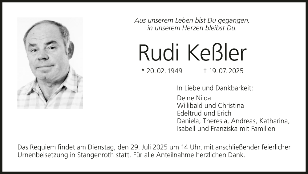 Hier finden Sie alle Traueranzeigen aus der Zeitung, die bisher für Rudi Keßler erschienen sind. Weitere Traueranzeigen, die in der Zeitung erscheinen, werden hier ebenfalls aufgelistet
