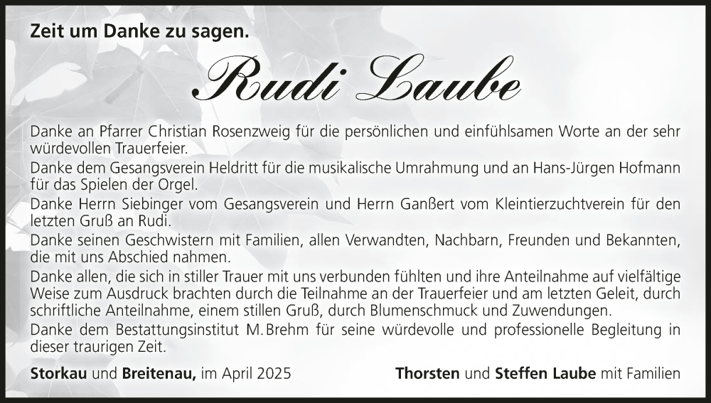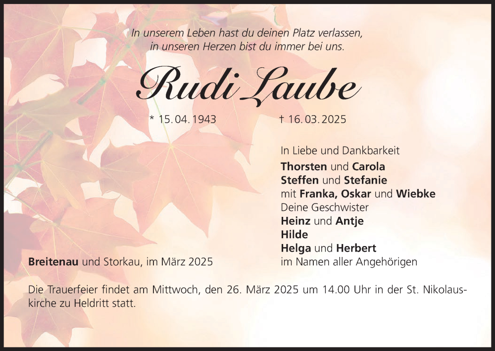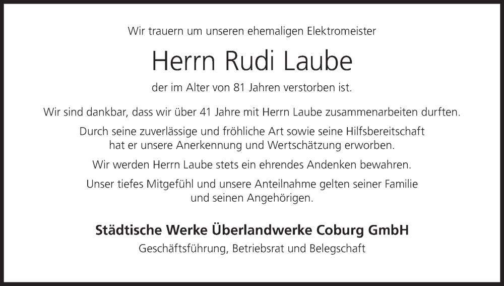 Hier finden Sie alle Traueranzeigen aus der Zeitung, die bisher für Rudi Laube erschienen sind. Weitere Traueranzeigen, die in der Zeitung erscheinen, werden hier ebenfalls aufgelistet